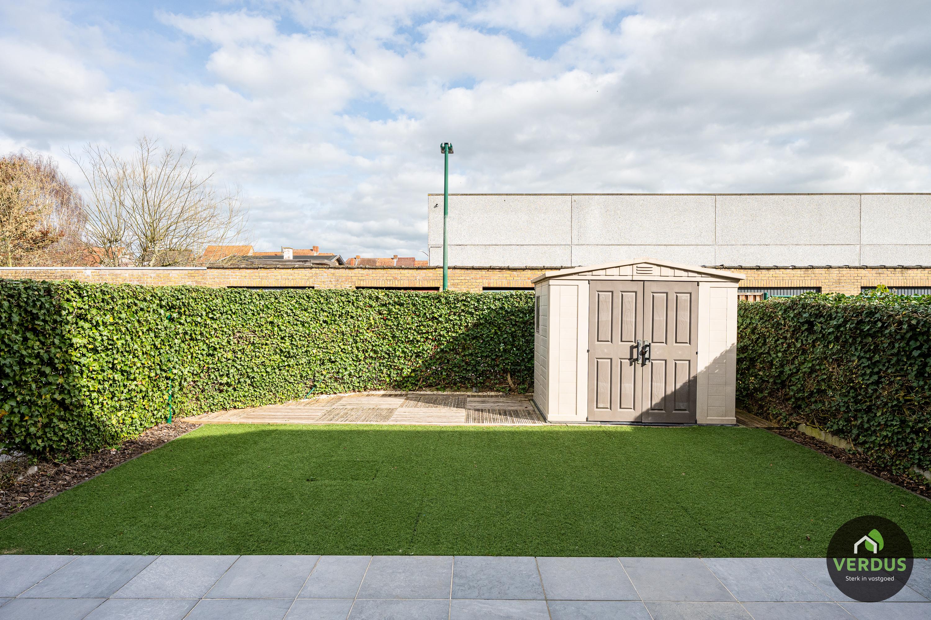 - Zonnige tuin met poortje, ruim terras (zonneluifel) en tuinberging